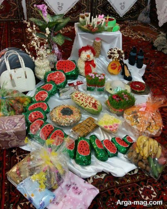 رسم و رسوم ایرانیان در شب یلدا این است که برای تازه عروس ها هدایایی را تهیه می کنند که این هدایا شامل لباس و آجیل و میوه و طلا و کیک و شیرینی و گل و … می باشد که بهتر است هر یک از این هدایا تزیین شوند سپس به منزل پدر عروس برده شوند و خانواده عروس نیز باید از خانواده داماد پذیرایی کنند.