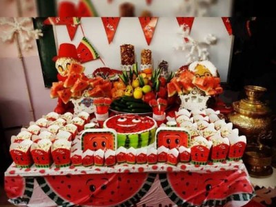 رایج ترین تم مخصوص شب یلدا ، تم هندوانه می باشد و شما می توانید انواع تنقلات شب یلدا نظیر کیک ، دسرها و … را به شکل هندوانه دیزاین کنید. همچنین می توانید روی هندوانه حکاکی هایی زیبا ایجاد نمایید. سپس هندوانه را در قسمتی مناسب از میز یا سفره شب یلدا قرار دهید. در صورتی که زمان کافی برای دیزاین شب یلدا را ندارید می توانید از تم های آماده مخصوص شب یلدا استفاده کنید.