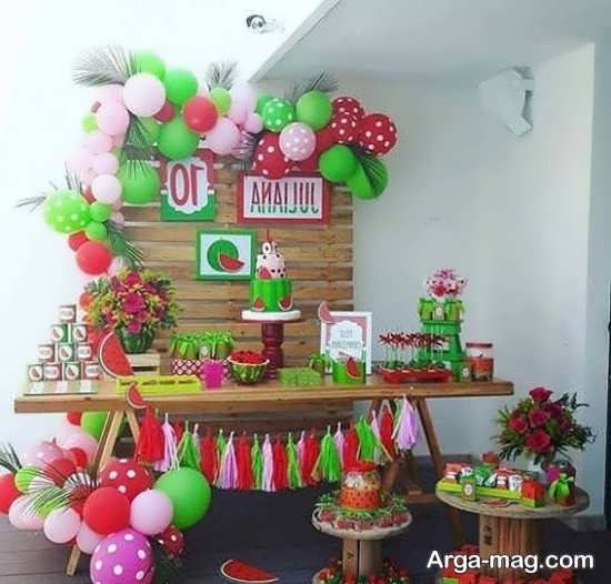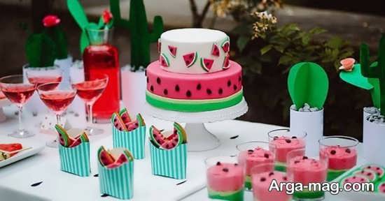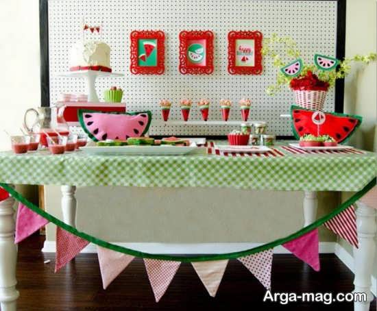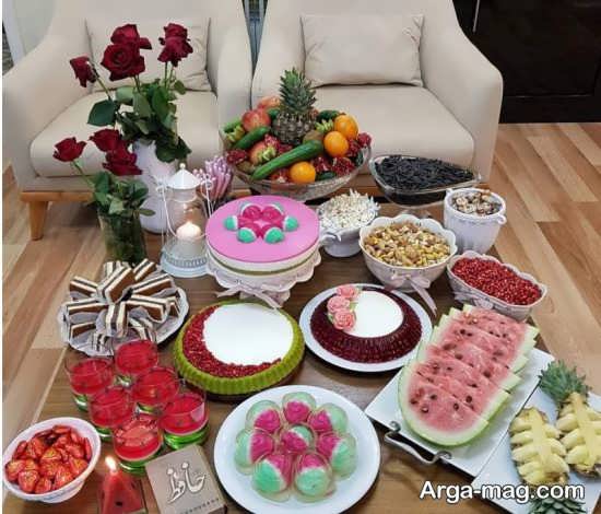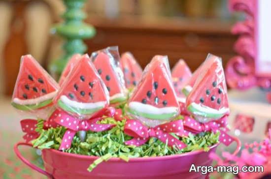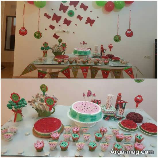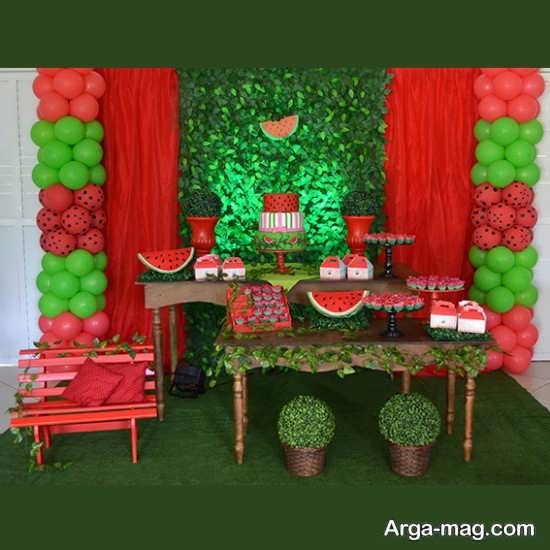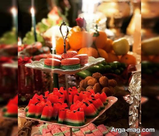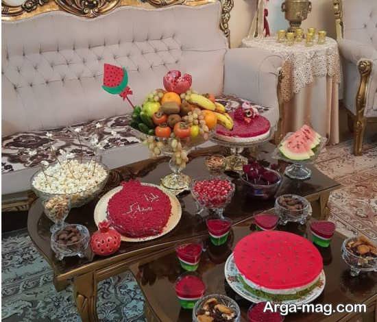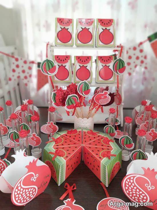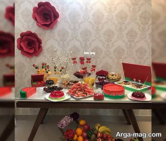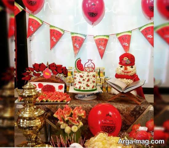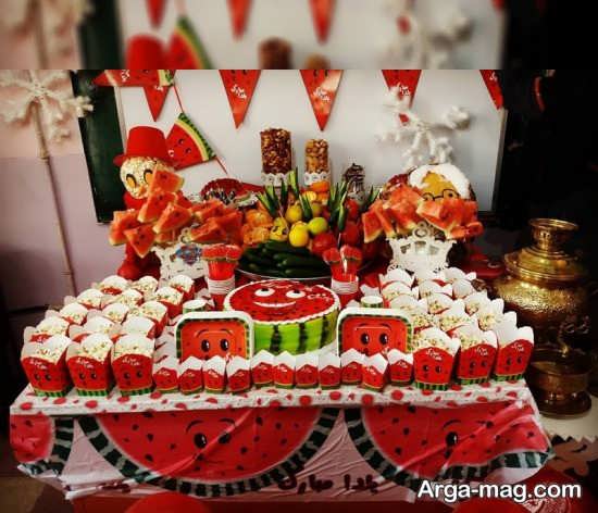 رایج ترین تم مخصوص شب یلدا ، تم هندوانه می باشد و شما می توانید انواع تنقلات شب یلدا نظیر کیک ، دسرها و … را به شکل هندوانه دیزاین کنید. همچنین می توانید روی هندوانه حکاکی هایی زیبا ایجاد نمایید. سپس هندوانه را در قسمتی مناسب از میز یا سفره شب یلدا قرار دهید. در صورتی که زمان کافی برای دیزاین شب یلدا را ندارید می توانید از تم های آماده مخصوص شب یلدا استفاده کنید.