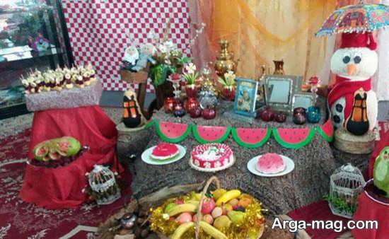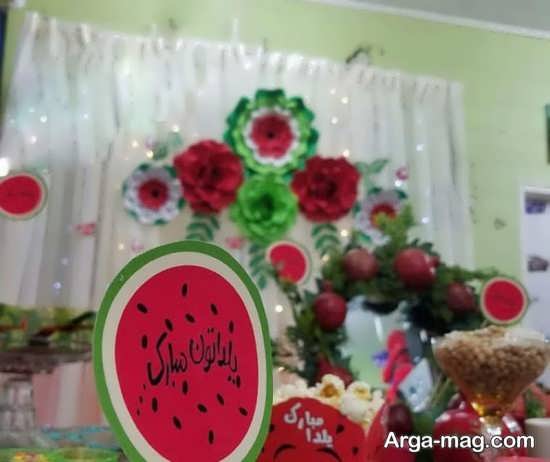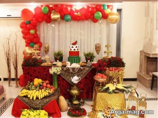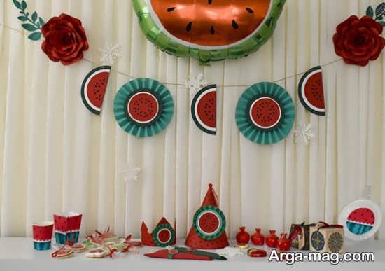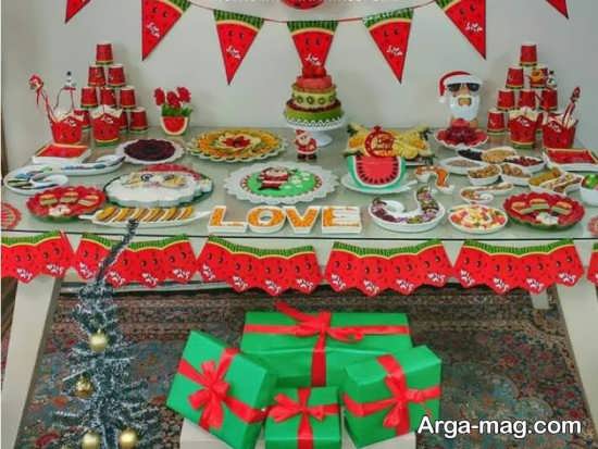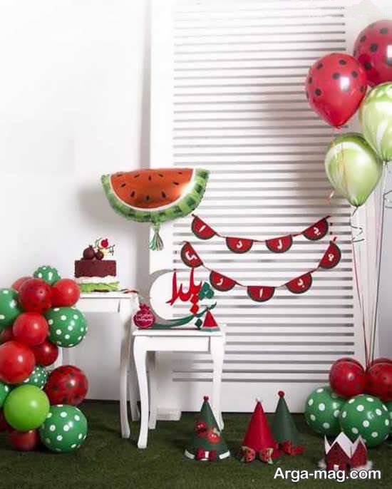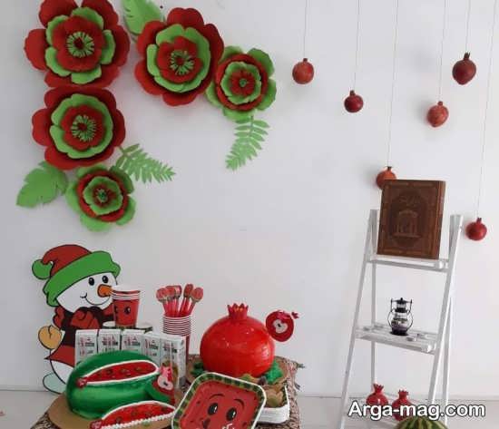 قبل از هر چیز بهتر است دیوار و سقف منزل تان را به کمک بادکنک ها با طرح هندوانه یا آدم برفی تزیین نمایید. همچنین شما می توانید دسته گلی با رنگ های سفید و قرمز و سبز را تهیه کنید. سپس دسته گل را روی درب ورودی منزل تان آویزان نمایید تا مهمان ها در زمان ورود به منزل شما غافلگیر شوند.