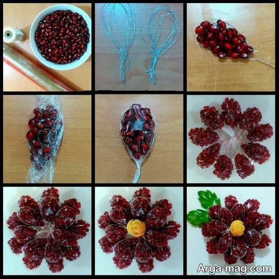 برای انجام این کار باید از مقداری سیم نازک مسی (سیم گل سازی) و سلفون استفاده کنید. ابتدا سیم را به شکل چند گلبرگ آماده نمایید، البته انتهای آن را نبندید. برای ساخت هر گلبرگ بهتر است از سیم دولا استفاده کنید، سپس سلفون را همانند تصویر زیر به دور سیم به صورت کیسه مانند بپیچید و مقداری انار دون شده را درون کیسه بریزید، دقت داشته باشید که میزان انار کمتر و بیشتر نشود. حال انتهای گلبرگ را ببندید. بعد از آماده کردن تمام گلبرگ ها، برای بستن آن ها به شکل گل رز، ابتدا گل برگ وسط را با استفاده از یک تکه سیم همانند تصویر ارائه شده به گلبرگ دیگر وصل کنید و این کار را تا گل برگ آخر ادامه دهید.