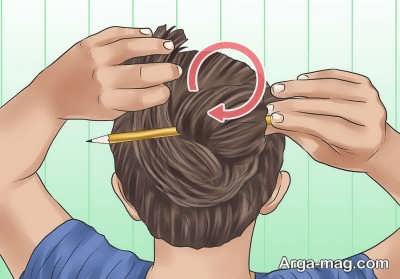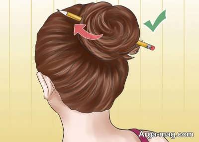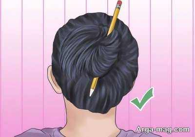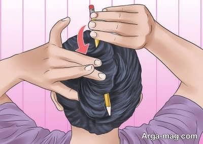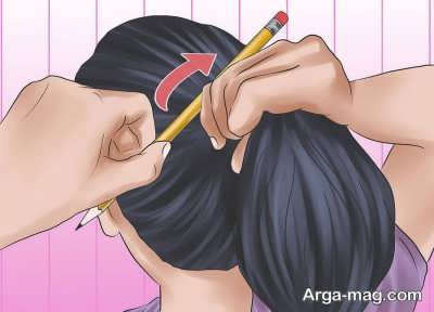 • ابتدا موهایتان را در قسمت بالایی سرتان جمع نمایید همچنین با توجه به طول مویی که دارید می توانید موهایتان را دور مداد بچرخانید. توجه داشته باشید که مداد را نباید بیش از اندازه و به صورت سفت بچرخانید زیرا با این کار موهایتان دچار آسیب می شوند.