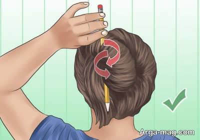 • در این مرحله باید مداد را در جهت عقربه های ساعت بچرخانید سپس انتهای غیر تیز مداد را بگیرید و آن را به سمت سر خود ببرید سپس مداد را به سمت پایین موها انتقال دهید.