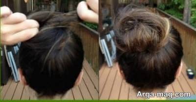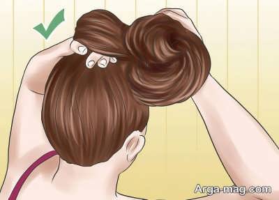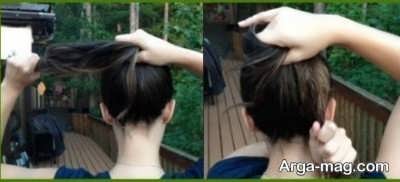 • مانند تصویر قسمت بلندتر دم اسبی را دور دست هایتان بچرخانید و به کمک موها یک حلقه را تشکیل دهید.
