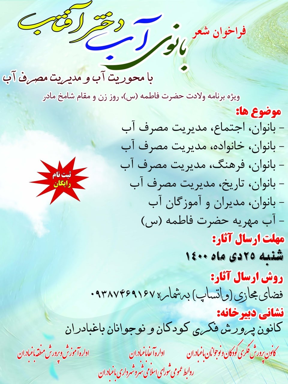 این جشنواره با مشارکت آب و فاضلاب استان اصفهان، اداره آموزش و پرورش، شهرداری و کانون پرورش فکری کودکان و نوجوانان باغبادران برگزار می شود و بانوان آثار خود را در قالب شعر، دل نوشته، کاردستی و نشریه دیواری با موضوع مهریه حضرت فاطمه (س)، تاریخ، فرهنگ، خانواده، اجتماع، مدیران و آموزگاران آب به نمایش می گذارند.