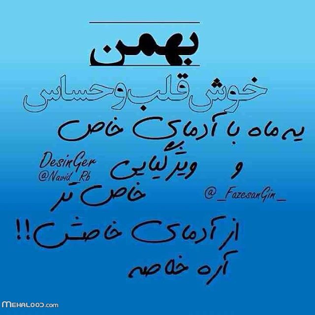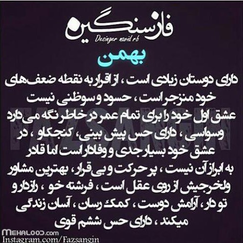 اگر عاشق متولد بهمن باشید ، با تمام وجود عاشق شما خواهد شد . تنها نکته ای که باید از آن دوری جویید ، این است که بر سر راه پیشرفت او قرار نگیرید . او عاشقی صادق است. دیر عصبانی می شود. آزار دهنده نیست . برنامه های خودش را دارد . هرگز تغییر نخواهد کرد . اگر نتوانید خود را با ایده های گوناگون مذهبی ، فرهنگی و اجتماعی او هماهنگ کنید ، هرگز شانسی برای دستیابی به عشق پایدار او نخواهید داشت . متولدین این ماه عموماً بسیار حسّاس ، استوار و ثابتقدم ، واقعاْ عاقل و تودار ، بدون ریا و تزویر ، انسان واقعاْ خوب ، دانا ، خونسرد ، روی خودش بیش از دیگران حساب میکند ، مستقل ، منطقی ، عاشق بشریّت و انسانیّت ، فکر دیگران را میخواند ، ثابتقدم ، آرامش دوست ، کمکرسان ، آسان زندگی میکند ، پرسهزدن را دوست دارد ، دارای حسّ ششم قوی ، علاقهمند به دوستان ، آزادی خواه ، بلندپرواز ، رامنشدنی ، هرجا برود بر میگردد ، جاهطلب ، از اقرار به گناه منزجر است ، دوستان بسیار زیادی دارد ، رازدار و تودار، اجتماعی ، تا حدودی خودخواه و مغرور، انتقاد را قبول ندارد ، فرشتهخو ، از تعریف لذّت میبرد ، راه و روش خود را به طور دائم تغییر میدهد ، منافع خود را به خاطر دیگران به خطر میاندازد ، سخاوتمند مخصوصاْ در دوستی ، دوستی او عمیق و شکوهمند است ، ولخرجیش از روی عقل است ، خوشقلب و مهربان ، کمحافظه ، بهترین مشاور ، پرحرکت و بیقرار ، کم علاقه به اصول سنتّی و قدرشناس.