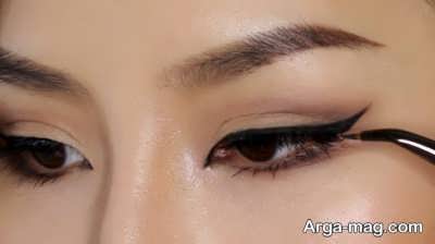 سپس از خط چشم مشکی برای کشیدن خط چشم استفاده کنید توجه داشته باشید که خط چشم دنباله دار و طولانی چشم ها را کشیده تر نشان می دهد و از گردی صورت شما می کاهد بنابراین بهتر است از این مدل خط چشم ها استفاده کنید برای تکمیل آرایش چشم هایتان نیز از ریمل حجیم کننده و مشکی استفاده نمایید.