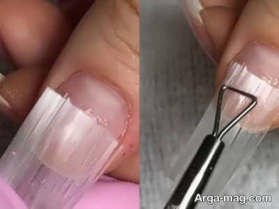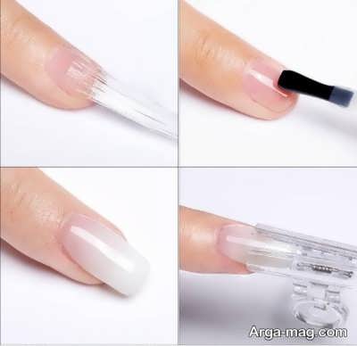 ۶. پودر یا ژل کاشت ناخن را بردارید و به کمک قلمو روی فیبرها بکشید. توجه داشته باشید که برای مواد گذاری باید قلم را روی فیبر بکشید و نباید هیچ فشاری را به آن وارد نمایید سپس قسمت ریشه و کل سطح ناخن را مواد گذاری کنید و بعد از اینکه مواد خشک شدند می توانید از کلیپس ناخن مخصوص کاشت ناخن استفاده نمایید تا حالت خمیده و قوس ناخن بوجود بیاید.