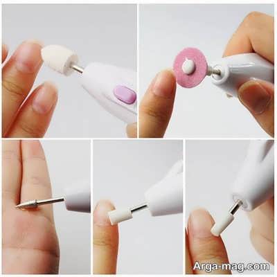 ۷. بعد از اینکه ناخن هایتان خشک شدند می توانید به کمک سوهان برقی آن ها دور گیری کنید و به کمک سوهان دستی نیز فرم دلخواهی را به ناخن های خود ببخشید.