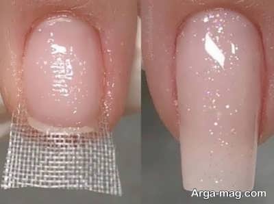 ۴. برای کاشتن ناخن به کمک روش پودری از چسب ناخن و برای کاشت ناخن به کمک ژل از تاپ ژل استفاده می شود که در صورت استفاده از چسب ناخن باید سرعت العمل بالایی داشته باشید و قبل از خشک شدن چسب ، فیبر یا سیلک ها را روی سطح ناخن خود بچسبانید. در صورتی که قسمت هایی از فیبر یا سیلک روی ناخن ها نچسبیده اند می توانید تاپ ژل بزنید و آن ها را تنظیم نمایید.