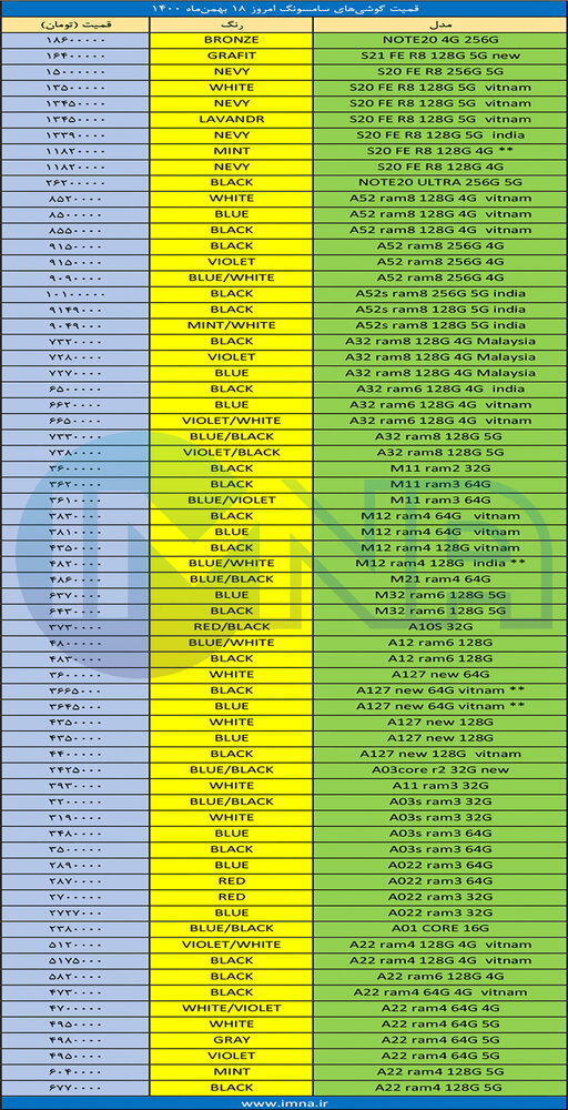 قیمت گوشیهای سامسونگ امروز ۱۸ بهمنماه ۱۴۰۰