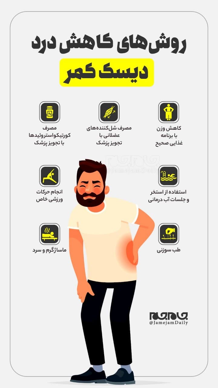متخصصان میگویند برای کاهش درد دیسک کمر میتوان از ماساژ گرم و سرد کمک گرفت و با برنامه غذایی صحیح، وزن را کاهش داد.
