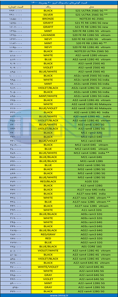 قیمت گوشیهای سامسونگ امروز ۲۰ بهمنماه ۱۴۰۰