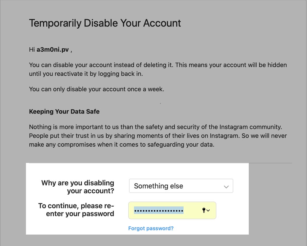 پس از لمس کادر?why are you disabling your account گزینه something else را انتخاب کنید و در ادامه رمز عبور اکانت خود را وارد کنید.