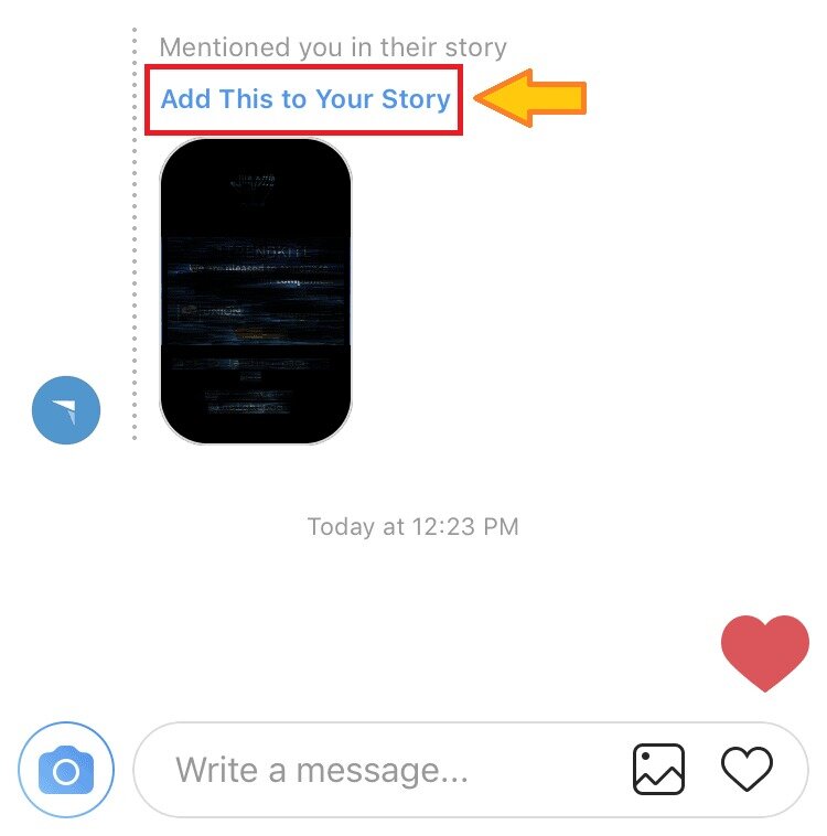 استوری کردن استوری های کاربران دیگر دو حالت دارد. حالت اول این است که یک کاربر شما را در یک استوری منشن کرده باشد. یعنی آیدی اینستاگرام شما را در استوری خود درج کرده باشد. در این حالت از طریق اینستاگرام به شما نوتیفیکیشنی ارسال خواهد شد که گویای این است که شما توسط کاربری در یک استوری منشن شده اید. در انتهای این پیغام گزینهای با عنوان Add this to your story درج شده است که شما میتوانید استوری که توسط شخصی در آن منشن شده بودید را در صفحه اینستاگرامی خود به اشتراک گذاری نمائید که در تصویر ذیل مشخص شده است.