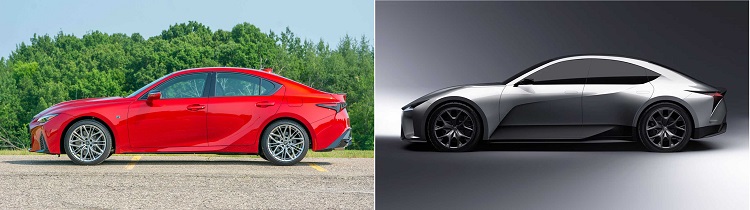 در کنار این جزئیات، سدان کانسپت الکتریکی لکسوس شباهتی به سدان فعلی IS نیز نشان میدهد (تصویر پایین)، اما مدل مفهومی جدی شکل قوس تهاجمی تری در دماغه دارد. با این حال، خط سقف مشابه است و هر دو دارای چراغهای عقب Y شکل هستند. قابل توجهترین تفاوتها در قسمت پایین و عقب بدنه است، جایی که سدان برقی دارای خروجی در پشت چرخهای جلو و قوس نرمتر برای گلگیر عقب است. از زاویه سه چهارم عقب نیز میتوان چین خوردگی را دید که از قسمت بالای خروجی پشت گلگیرهای جلو تا پایه ستون C کشیده شده است. این امر عنصر شکوفایی بصری واضحی را به طراحی مدل مفهومی میدهد. همچنین، سقف به جای اتصال زاویه دارتر بین قطعات در مدل IS، به آرامی به سمت گلگیر عقب جریان مییابد. یک اسپویلر دم اردکی نیز در عرشه عقب مدل مفهومی تعبیه شده است.