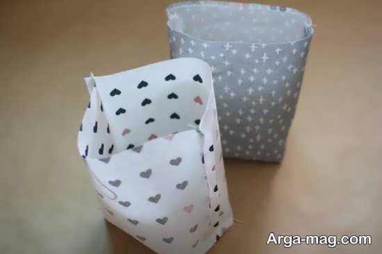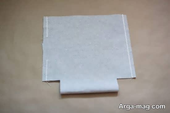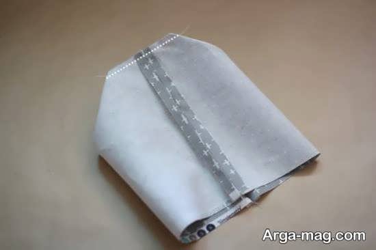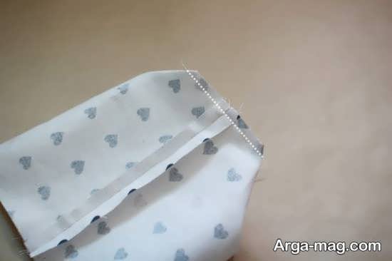 بعد از به پایان رسیدن دوختن، از قسمتی که در بالای پارچه ندوخته اید، پارچه آستری را درون پارچه رویه کار قرار دهید. دقت داشته باشید که قسمت رویه و یا به بیانی همان راست پارچه به سمت یکدیگر گذاشته شده باشند. در آخر هم قسمت بالای پارچه بدوزید.