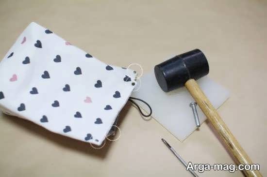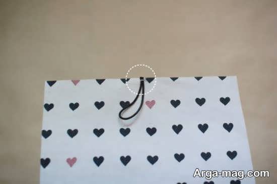 پاکت شما نسبتا آماده است، کنج های آن را با استفاده از میخ پرچ سفت نمایید تا پاکت هدیه شما زاویه دار شود. در صورت در دسترس نبودن با استفاده از دکمه های ریز این کار را انجام دهید.