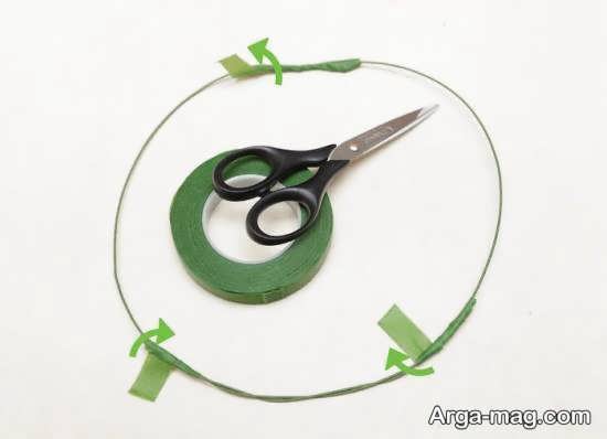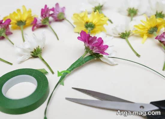 نوار سبز رنگ را گرداگرد سیم یک لایه و یا در صورت تمایل چند لایه پیچانده و سپس اقدام به زدن و ثابت کردن گل ها کنید(این نوار سبز رنگ مخصوص را می توانید از گل فروشی و گلسازی ها تهیه نمایید.). به این صورت که گل های دلخواه خود را تهیه و ساقه ها را از انتهای گل ۳ – ۵ سانتیمتر ببرید.