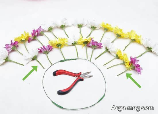 بهتر است ابتدا طرح مورد نظر خود را با قرار دادن گل ها در کنار یکدیگر بر روی میز بسازید و سپس آن را بر روی سیم پیاده کنید.