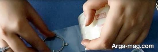 در مرحله بعدی، مقداری از چسب پنج سانتی را برش زده و سپس یک سمت قاب گردنبند را به آن بچسبانید و بر روی سطح میز بکشید تا لبه ها به طور کامل به آن بچسبند.