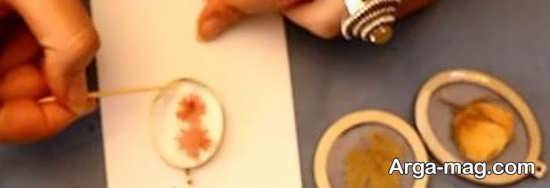 اکنون داخل قالب که یک طرف آن را با چسب ۵ سانتی پوشانده اید، را با زرین پُر کنید به طوری که تا یک سوم سطح قالب برسد. بعد گل ها را به وسیله پنس بردارید و بر روی رزین قرار دهید، بهتر است این کار را بر روی سطحی صاف یا یک میز تراز انجام دهید.