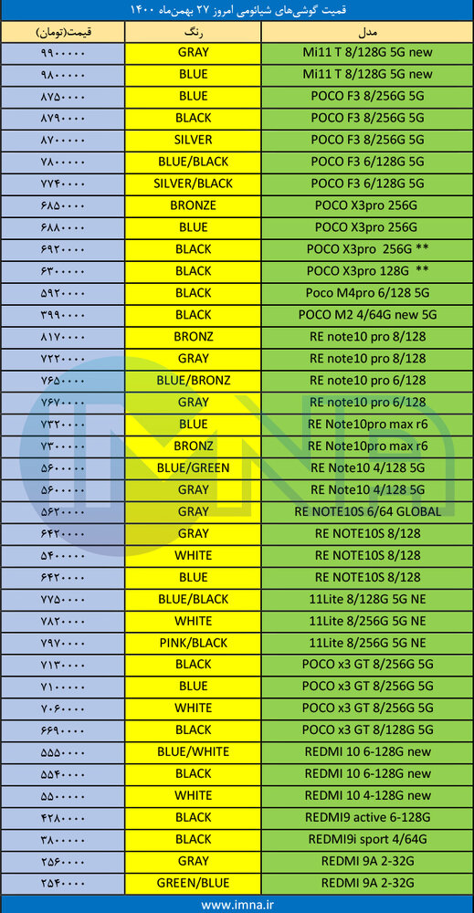 رویداد ایران > رویداد > اقتصادی > قیمت روز گوشی‌ شیائومی + لیست جدیدترین انواع موبایل (۲۷ بهمن)