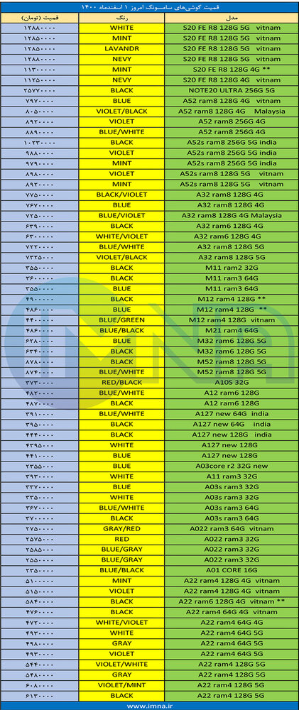 قیمت روز گوشی سامسونگ 1 اسفند 1400