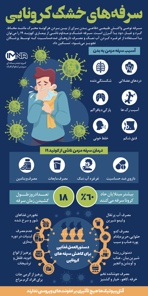 سرفه نوعی واکنش طبیعی دفاعی بدن برای از بین بردن هرگونه محرک مانند مخاط، گرد و غبار، دود یا آلرژن است. سرفه خشک و مداوم ناشی از بیماری کووید ۱۹ را میتوان با استفاده از غرغره کردن آب نمک و مصرف داروهای ضدحساسیت که توسط پزشکان تجویز میشود، تسکین داد.