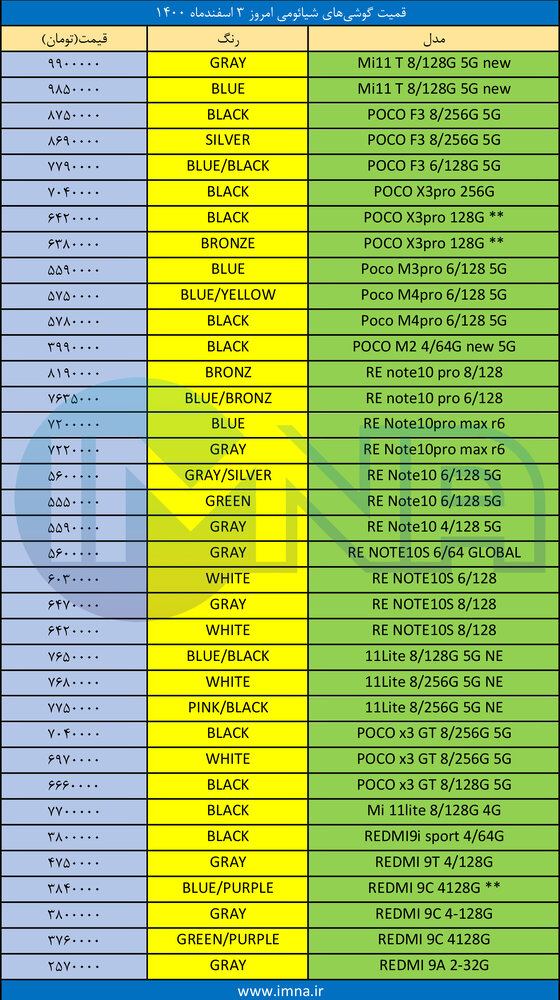 رویداد ایران > رویداد > اقتصادی > قیمت گوشی‌ شیائومی 3 اسفند 1400