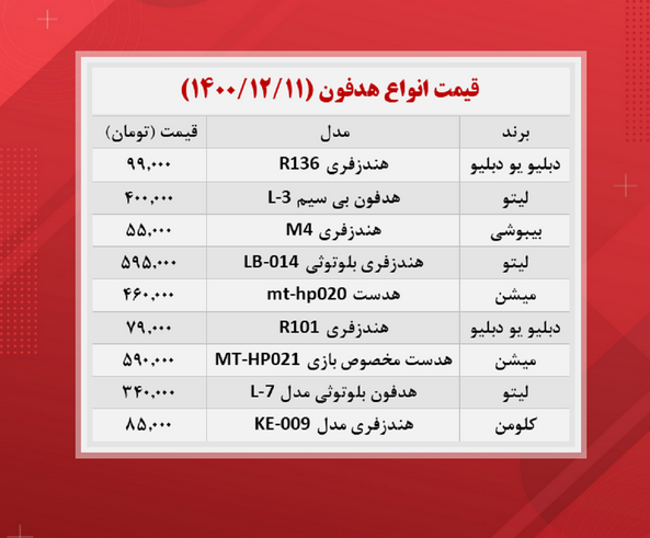 اقتصاد آنلاین نوشت: قیمتهای درج شده هدفون مربوط به سایتهای فروش اینترنتی است و به دلیل نوسان قیمتها در بازار ممکن است با نرخ امروز بازار متفاوت باشد.