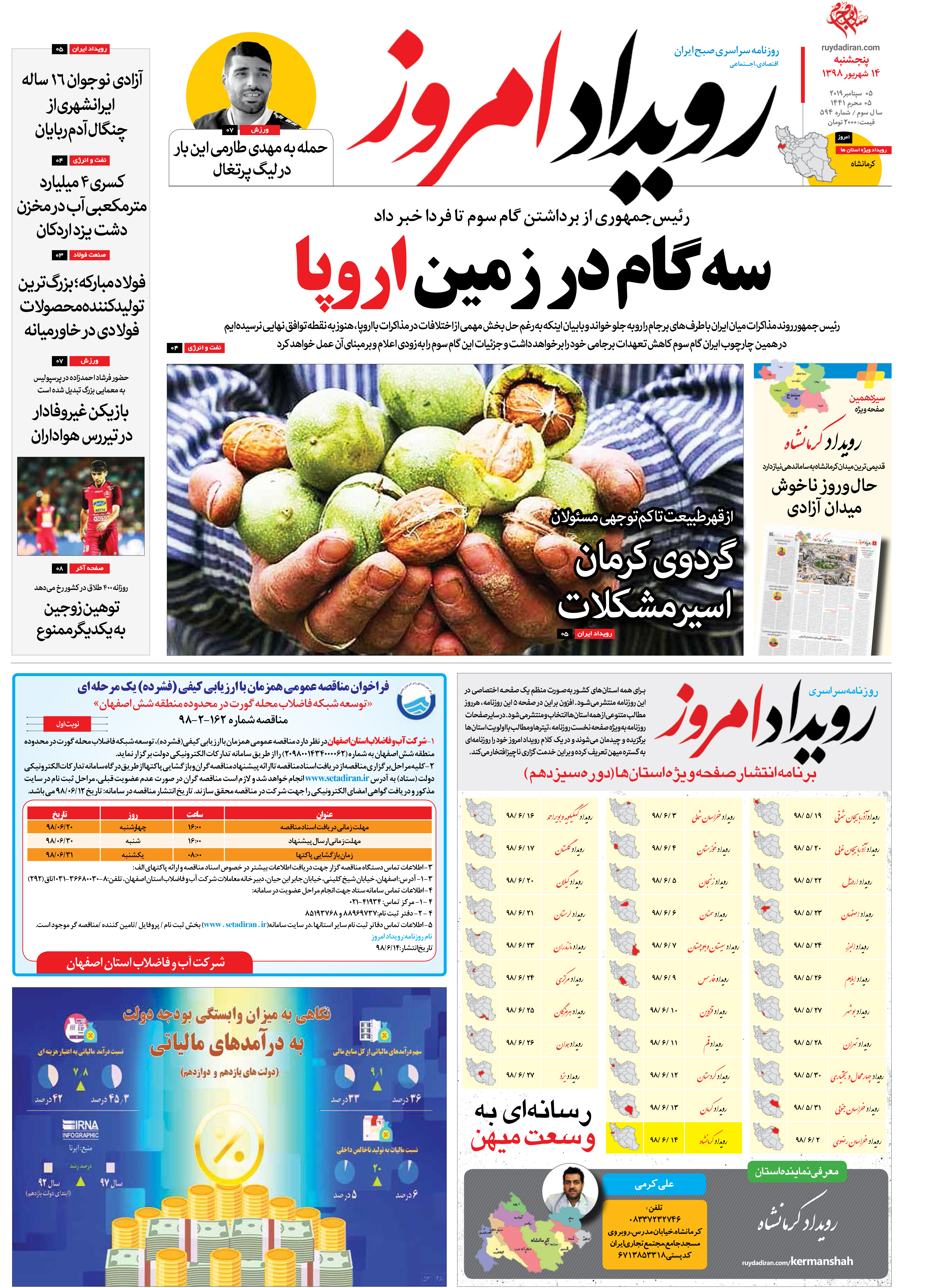 روزنامه رویداد امروز پنج شنبه ۱۴ شهریور ۱۳۹۸