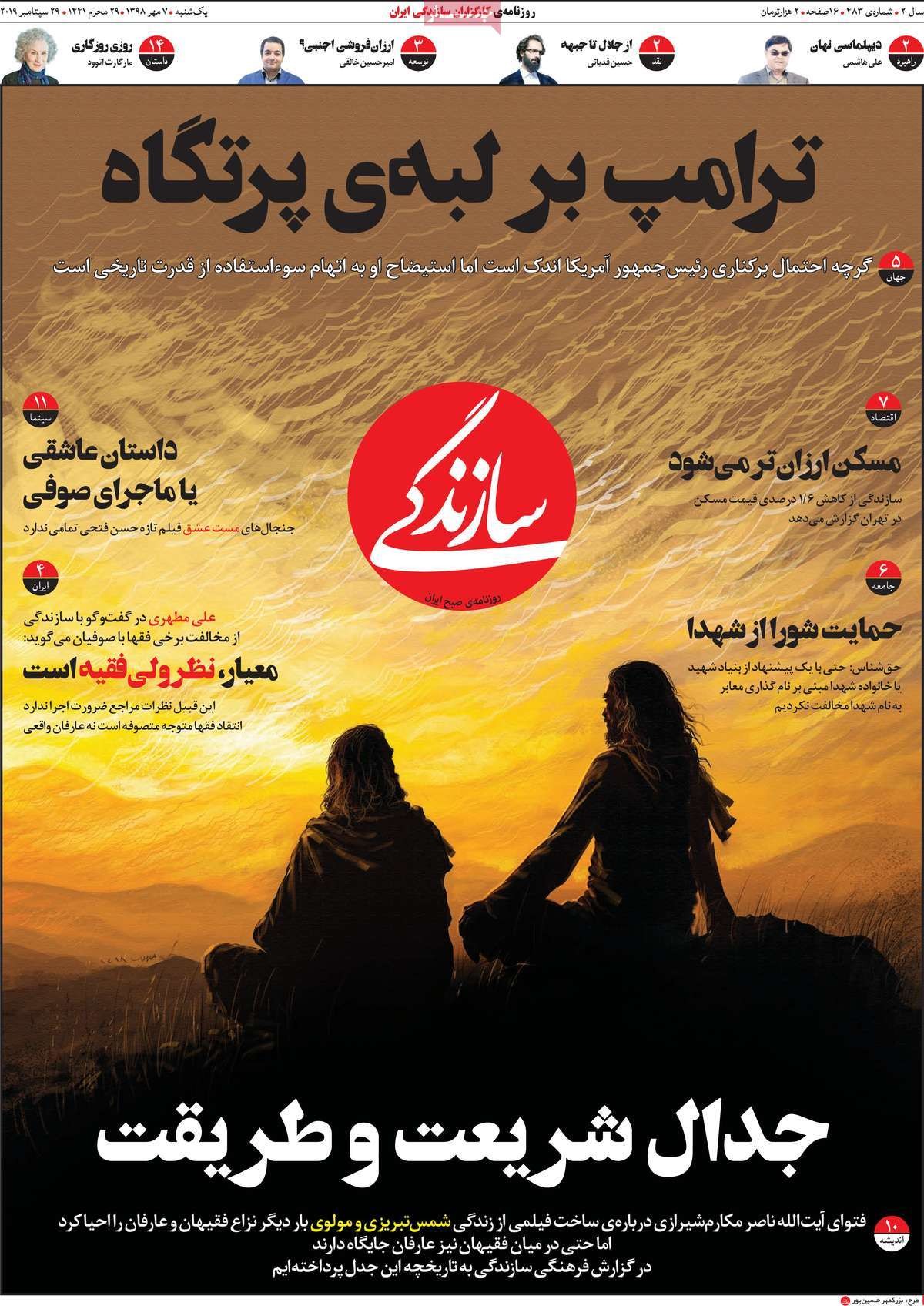 تصویر صفحه نخست روزنامه سازندگی را در زیر می‌بینید.