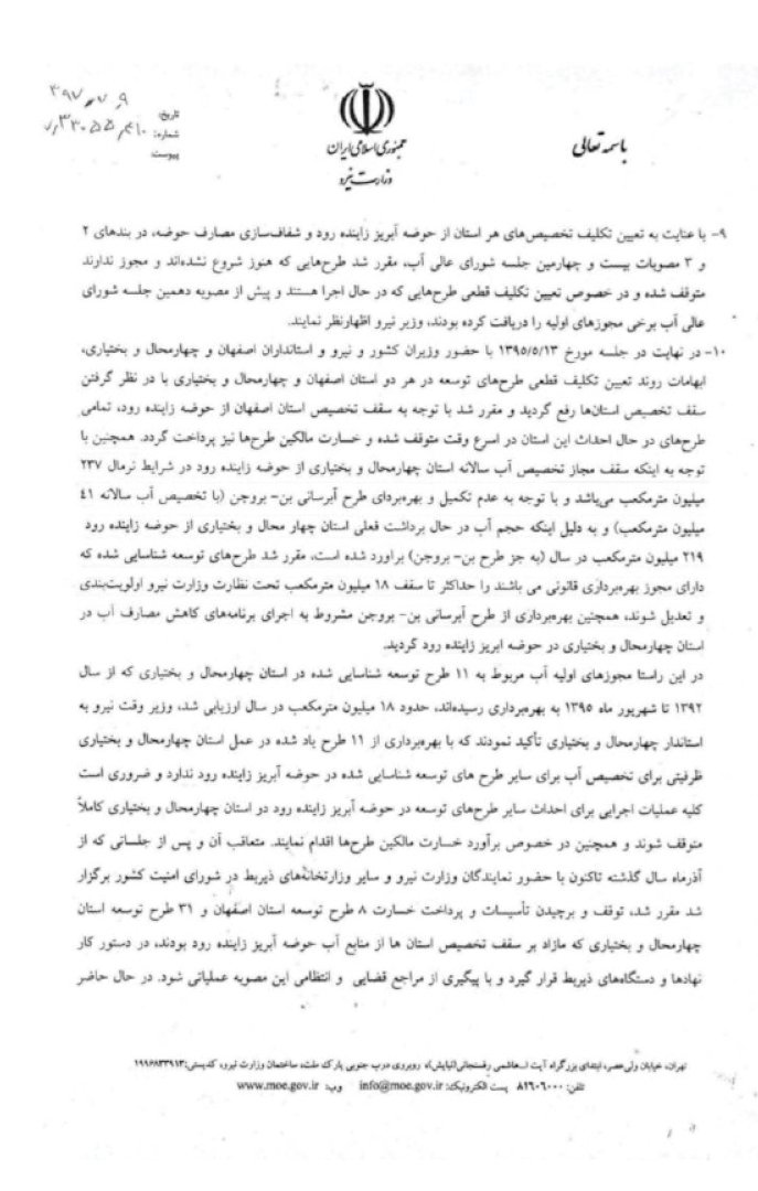 استان چهارمحال و بختیاری سهمیه تخصیص نیافتهای در حوضه زایندهرود ندارد
