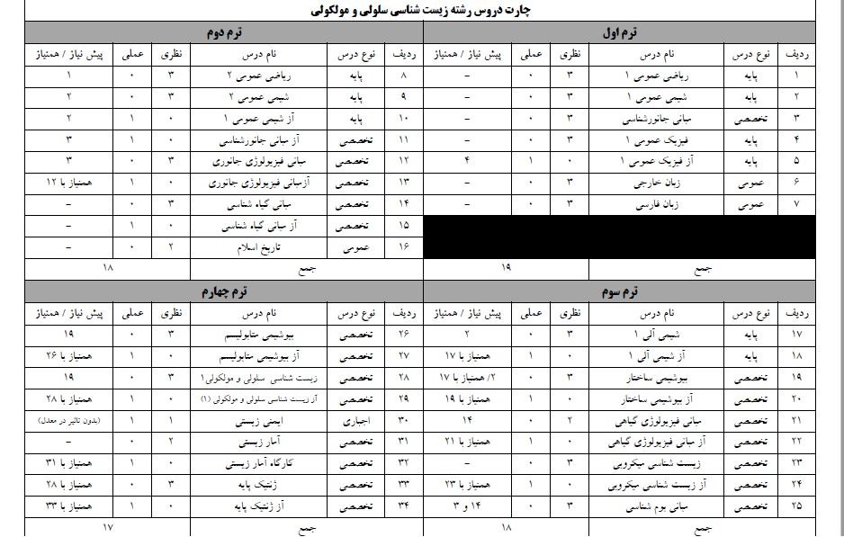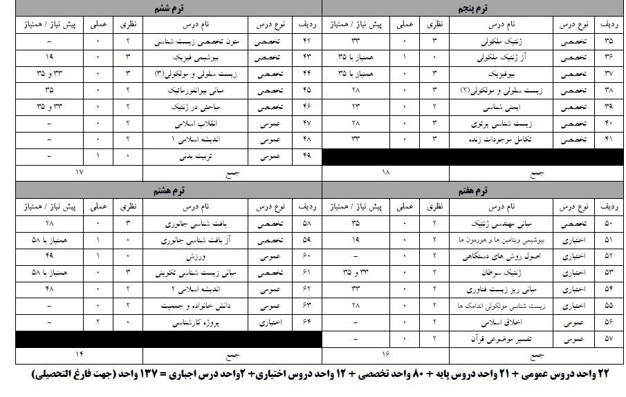 | تعداد کل درس ها : ١٤١ واحد دروس پایه : ٢٠ واحد دروس تخصصی: ٧٨ واحد دروس اختیاری : ١٧ واحد دروس عمومی : ٢٦ واحد |