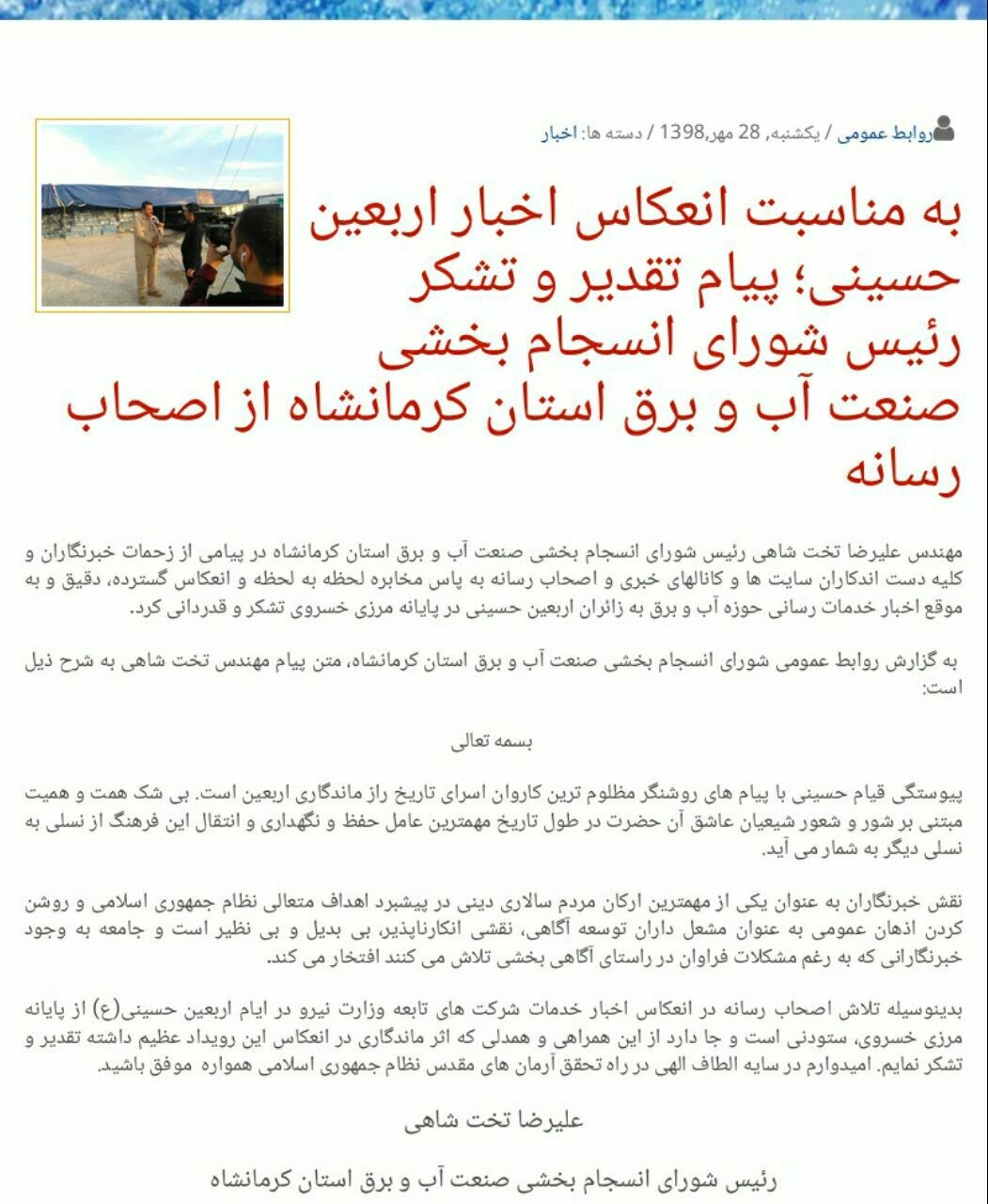 پیام تقدیر و تشکر رئیس شورای انسجام بخشی صنعت آب و برق استان کرمانشاه از اصحاب رسانه