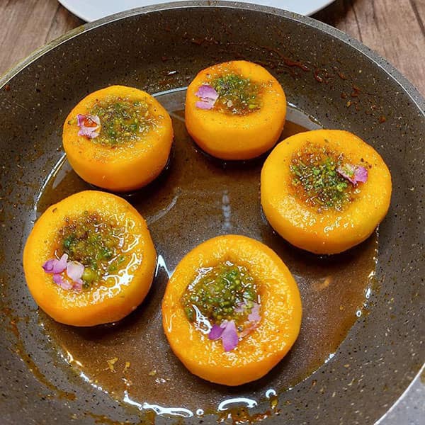 پس از اینکه سیب ها به خوبی پختند و نرم شدند، زعفران دم کرده را اضافه می کنیم، سپس با استفاده از یک برش تمیز شربت زعفرانی را روی بدنه و قسمت های بالایی سیب ها می مالیم تا خوشرنگ و درخشان شوند.