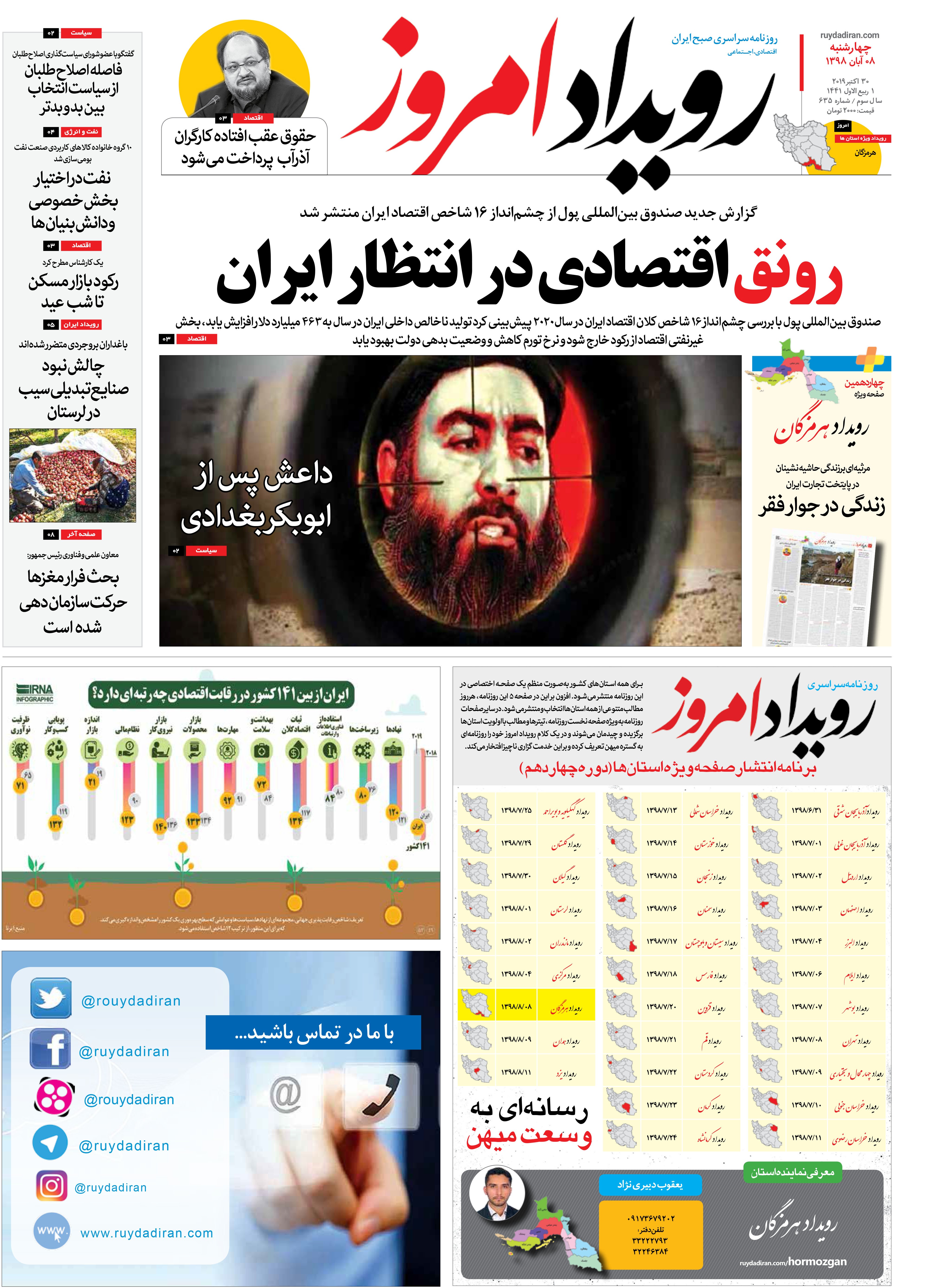 روزنامه رویداد امروز چهارشنبه 8 آبان ۱۳۹۸