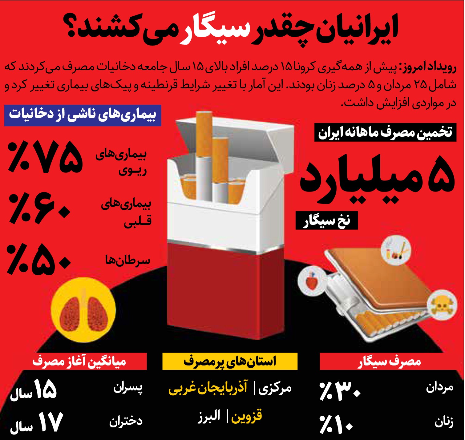 رویداد امروز: پیش از همهگیری کرونا ۱۵ درصد افراد بالای ۱۵ سال جامعه دخانیات مصرف میکردند که شامل ۲۵ مردان و 5 درصد زنان بودند. این آمار با تغییر شرایط قرنطینه و پیکهای بیماری تغییر کرد و در مواردی افزایش داشت.