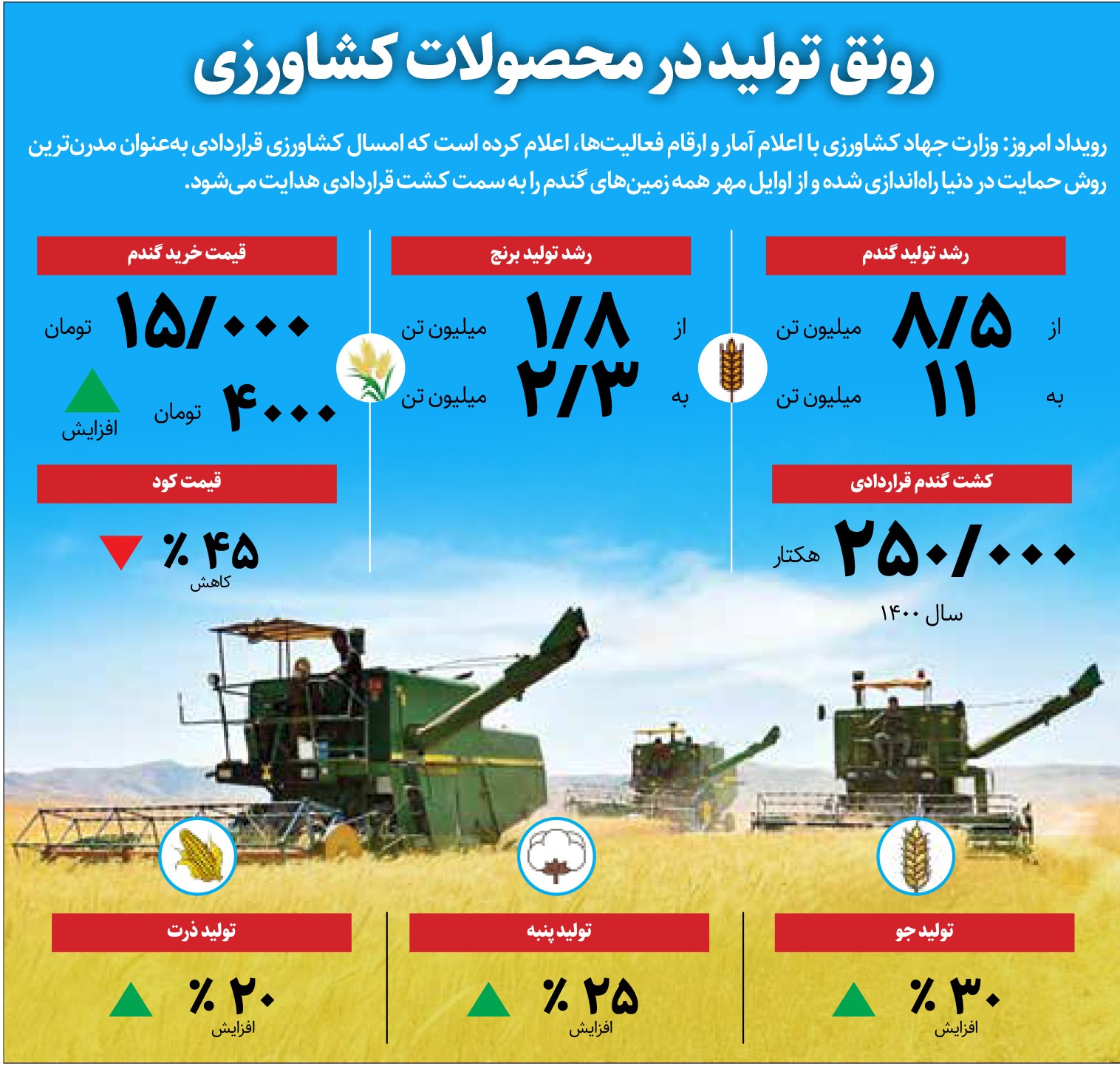رویداد امروز: وزارت جهاد کشاورزی با اعلام آمار و ارقام فعالیتها، اعلام کرده است که امسال کشاورزی قراردادی بهعنوان مدرنترین روش حمایت در دنیا راهاندازی شده و از اوایل مهر همه زمینهای گندم را به سمت کشت قراردادی هدایت میشود.