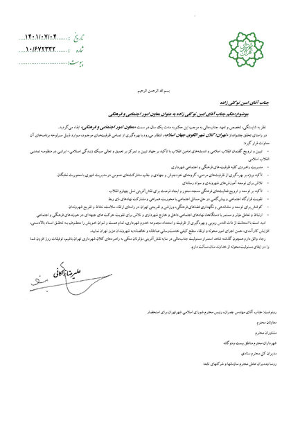 بر اساس حکم شهردار تهران محمد امین توکلی زاده به عنوان معاون امور فرهنگی و اجتماعی شهرداری تهران ابقاء شد.