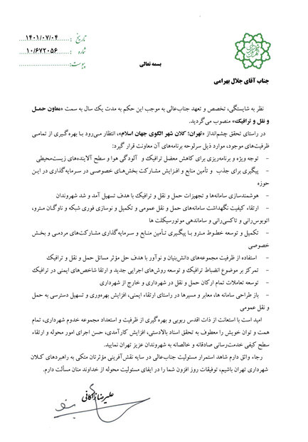 شهردار تهران طی حکمی دیگر نیز جلال بهرامی که پیش از این معاون خدمات شهری و محیط زیست شهرداری تهران بود را جانشین مجتبی شفیعی معاون حمل و نقل شهرداری تهران قرار داد.