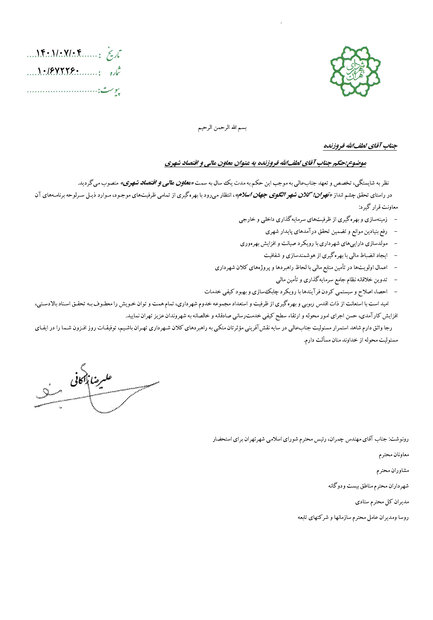 همچنین طی حکمی لطف الله فروزنده که پیش از این معاون برنامهریزی، توسعه سرمایه انسانی و امور شورا شهرداری تهران بود به عنوان جانشین ابوالفضل فلاح و معاون امور مالی و اقتصادی شهرداری تهران انتخاب شد.