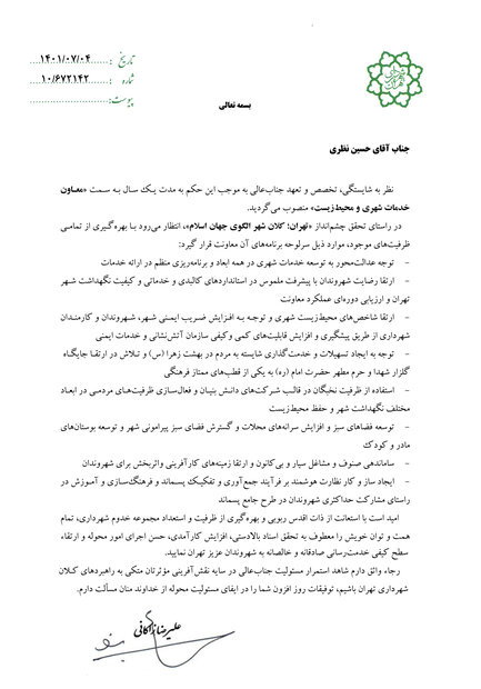 همچنین علیرضا جاوید به عنوان جانشین حسین نظری معاون امور مناطق شهرداری تهران منصوب شد؛ جاوید از ۱۷ مرداد ۱۴۰۰ سرپرستی شهرداری تهران را تا زمان صدور حکم انتصاب علیرضا زاکانی، شهردار منتخب تهران، بر عهده گرفته بود.