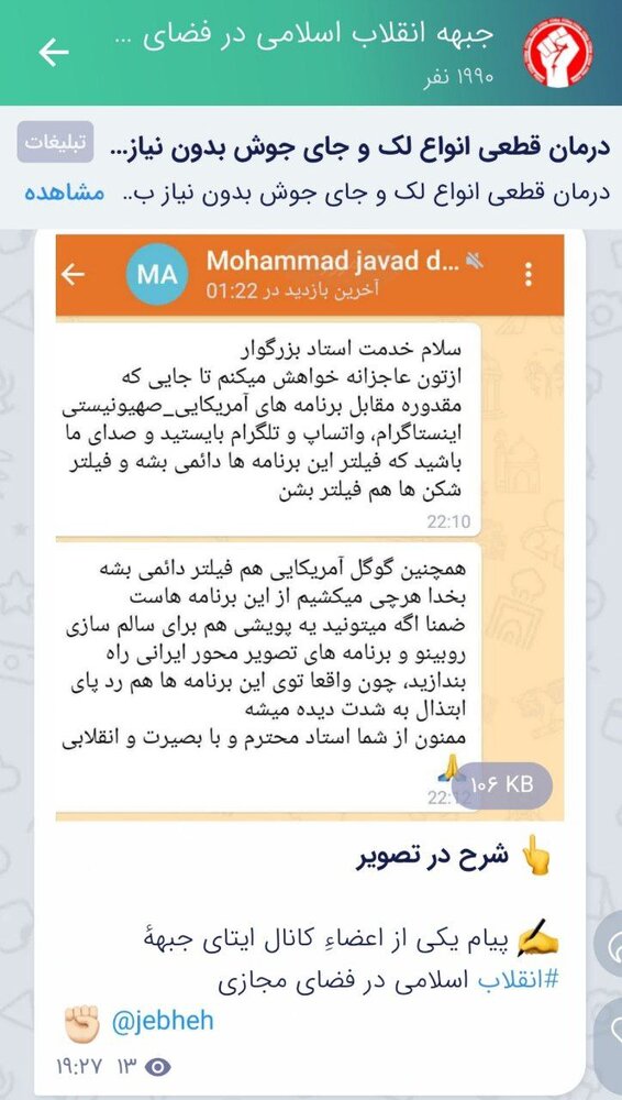 کانال تشکلی به نام جبهه انقلاب اسلامی در فضای مجازی که دبیرکلی اش را روح الله مومن نسب برعهده دارد کامنتی از یکی از اعضایش را منتشر کرده و خواهان صیانت از پلتفرم ایرانی روبینو شده است!
