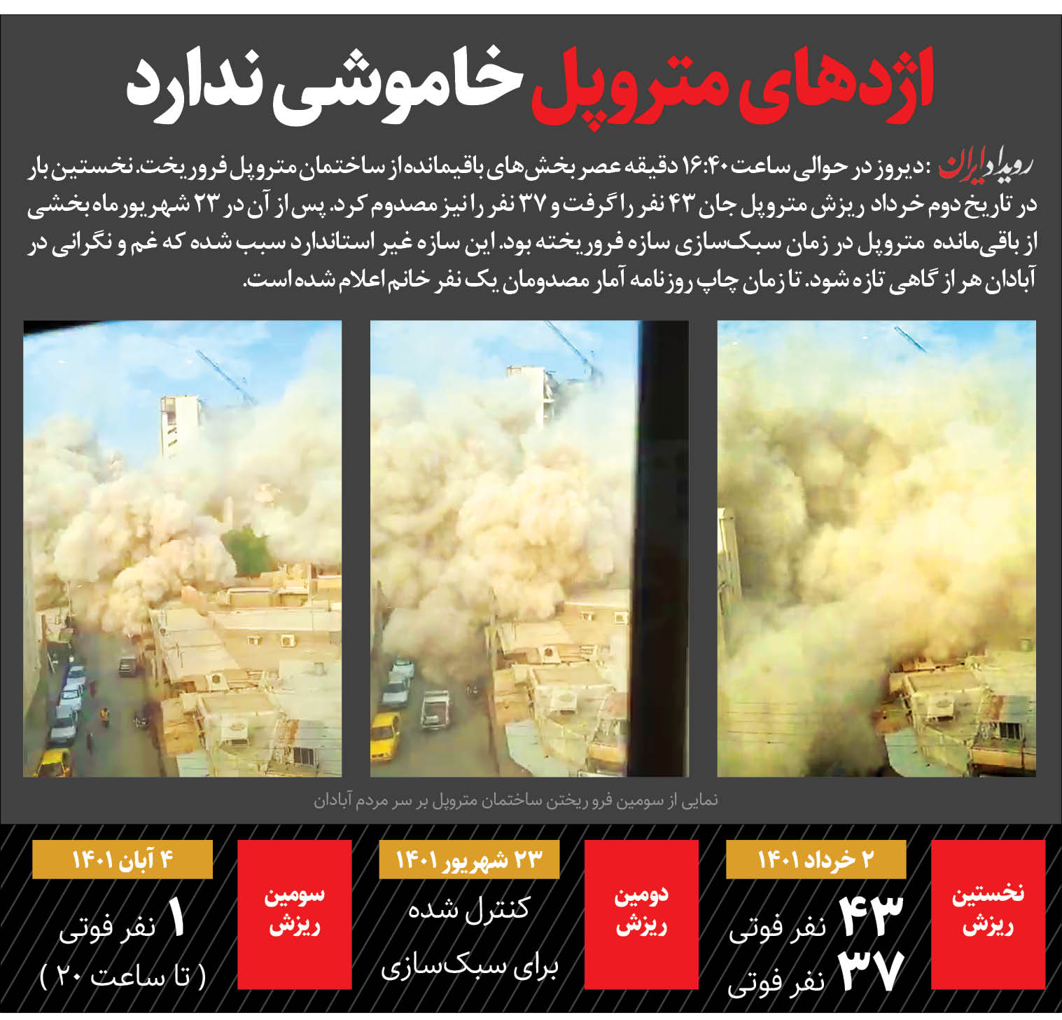 دیروز در حوالی ساعت ۱۶:۴۰ دقیقه عصر بخش‌های باقیمانده از ساختمان متروپل فروریخت. نخستین بار در تاریخ دوم خرداد  ریزش متروپل جان ۴۳ نفر را گرفت و ۳۷ نفر را نیز مصدوم کرد. پس از آن در 23 شهریورماه بخشی از باقی‌مانده  متروپل در زمان سبک‌سازی سازه فروریخته بود. این سازه غیر استاندارد سبب شده که غم و نگرانی در آبادان هر از گاهی تازه شود. تا زمان چاپ روزنامه آمار مصدومان یک نفر خانم اعلام شده است.