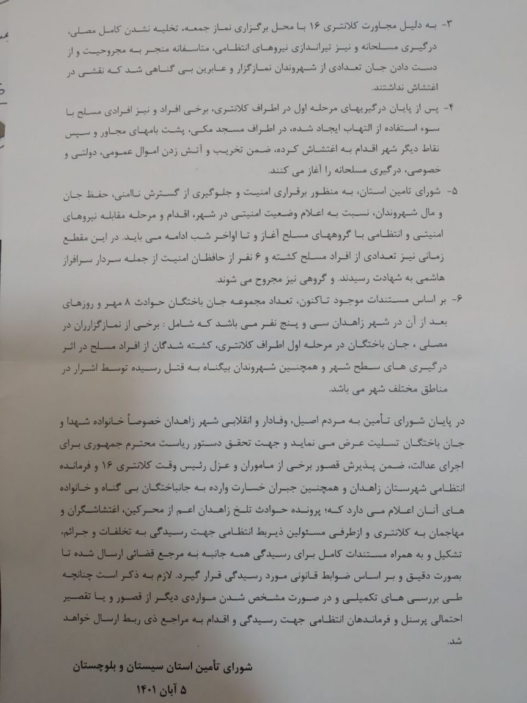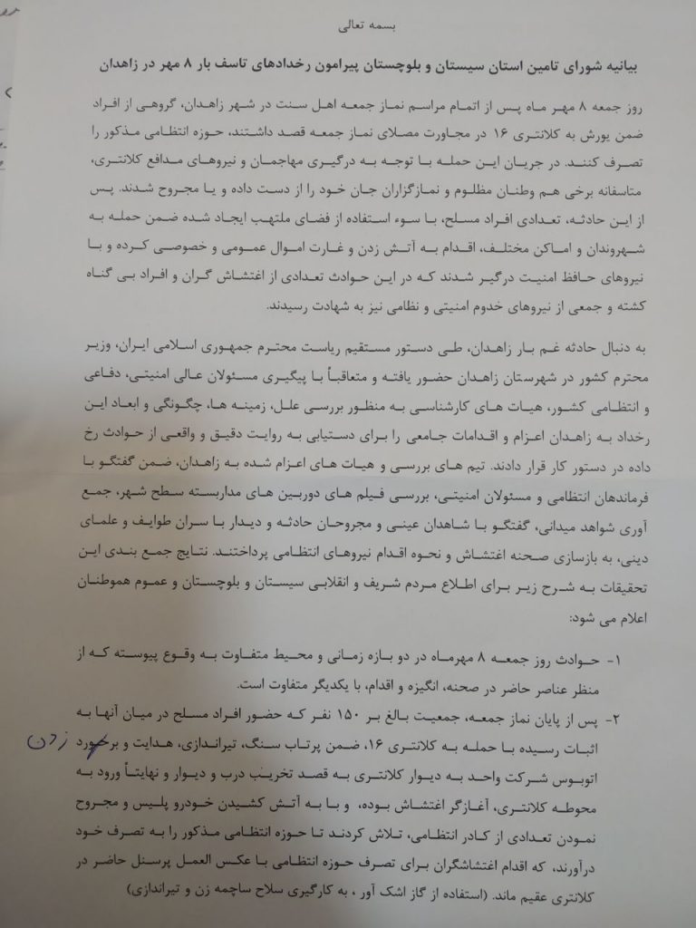 اطلاعیهی مهم شورای تامین سیستان و بلوچستان دربارهی حوادث ۸ مهر [+فیلم و سند]