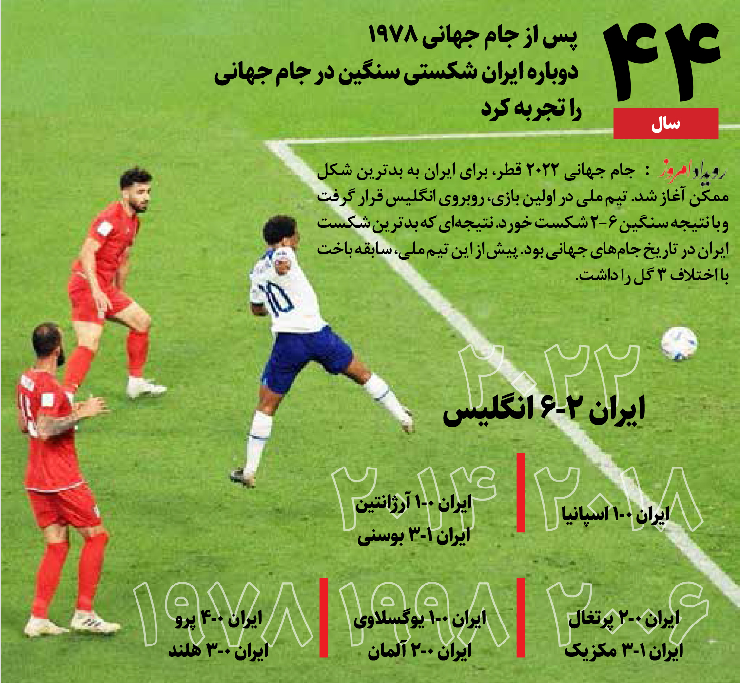 جام جهانی 2022 قطر، برای ایران به بدترین شکل ممکن آغاز شد. تیم ملی در اولین بازی، روبروی انگلیس قرار گرفت و با نتیجه سنگین 6-2 شکست خورد. نتیجهای که بدترین شکست ایران در تاریخ جامهای جهانی بود. پیش از این تیم ملی، سابقه باخت با اختلاف 3 گل را داشت.