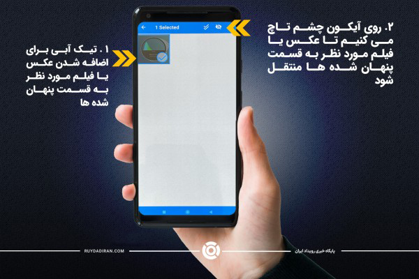 - با لمس آیکون چشم فیلم ها و عکس به قسمت پنهان نشده ها می روند و تیک آبی برای افزودن عکس و فیلم به بخش مخفی هاست: