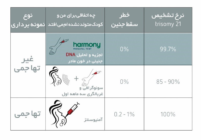 همانطور که در شکل زیر می بینید دقت آزمایش هارمونی بسیار نزدیک آزمایش تهاجمی آمنیوسنتز است با این تفاوت که خطرات سقط جنین که در آمنیوسنتز وجود دارد در آزمایش هارمونی دیده نمی شود.